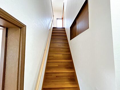 【リフォーム済】階段です。壁天井のクロスの張替えを行いました。また手すりを新設しましたので小さなお子様やお年寄りの方でも安全に上り下りができますね!
