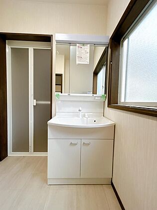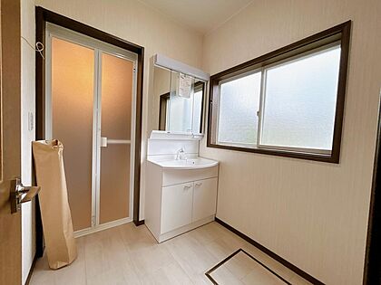 【リフォーム済】洗面台の向かい側に洗濯機を置くことができます。床はクッションフロアを張替え、壁天井のクロスは張替えました。