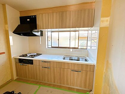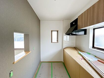 【リフォーム中】キッチン後ろです。冷蔵庫や食器棚を置くスペースがございます。