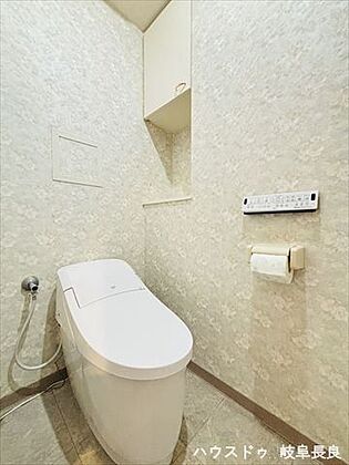 小物を飾れる棚が付いたお手洗い♪明るく、清潔感のあるトイレです。棚には雑貨を飾ったり、観葉植物を置いても良いですね。