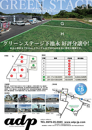 | その他 | ●プロパンガス ●浄化槽 ●所有権 ●売主・代理 ●前面道路6m以上 ●更地 ●子育てに便利な施設が充実 |