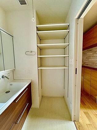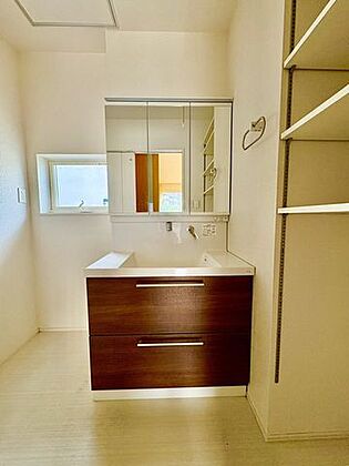 3面鏡裏も収納になっているのでお化粧品や洗剤のストック等たくさん収納できますよ。見せない収納でお洒落な空間へ。