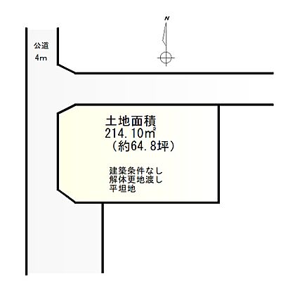 | 土地面積/坪(坪単価) | 214.10m2(登記簿)/64.88坪(21.40万円) | 代表的な接道 | 二方 公道 北 4m、西 4m ※詳細は備考欄をご確認ください  |
