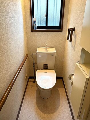 明るい窓から自然光が差し込むトイレ空間。清潔感あふれる白を基調とした内装に手すりも備わり、安心と快適さを両立しています。