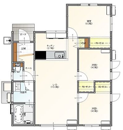 機能性と快適性を追求した平屋。広々としたLDK(16.7帖)が広がり、家族のコミュニケーションを育む中心となります。キッチン(3.7帖)はLDKに隣接し、家事動線も考慮されています。