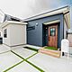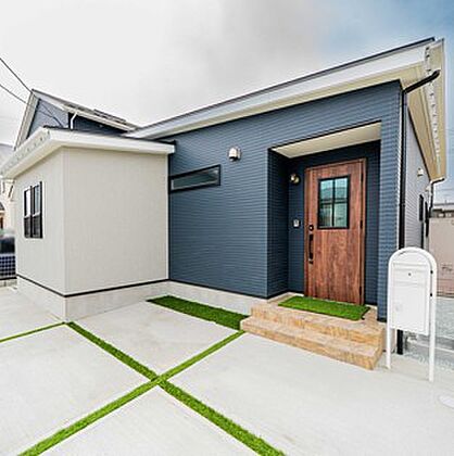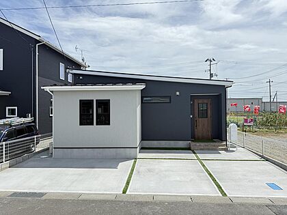 片流れ屋根が特徴的なモダンな平屋の家。白い壁と濃い青の外壁がスタイリッシュな印象を与えます。3台駐車可能です。