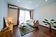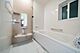 白を基調とした清潔感あふれる空間に、奥の壁にはスタイリッシュなアクセントクロスが施されています。