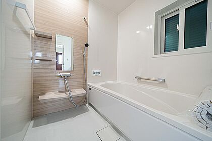 清潔感あふれるホワイトと、温かみのある木目調のデザインが融合したモダンなバスルームです。