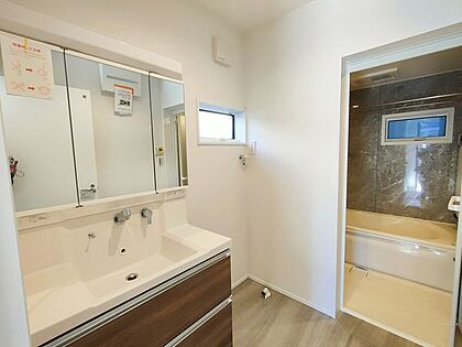 •  洗面脱衣所◎室内洗濯機置き場◎三面鏡キャビネット付シャワードレッサー◎ハイバックカウンター&ボウル◎エコクリック水栓