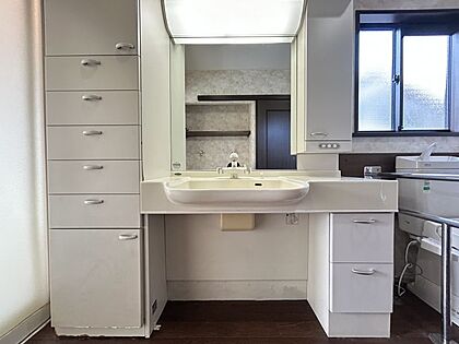 洗面化粧台横にはタオルや日用品が整頓できる棚を設置!