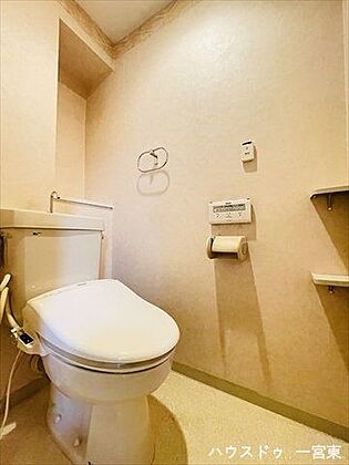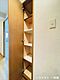 収納棚付きのトイレです。トイレットペーパーのストックも置いておけますね。