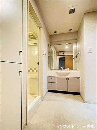 洗面台には収納もしっかりついていますので、洗剤やシャンプーなどのストックもできます。大きな鏡で朝の身支度も楽々♪