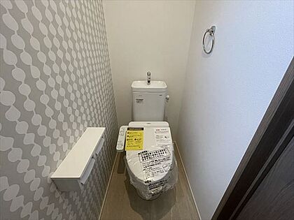 災害時も安心のタンク式トイレ。かわいいアクセントクロスで気分転換になりますね。