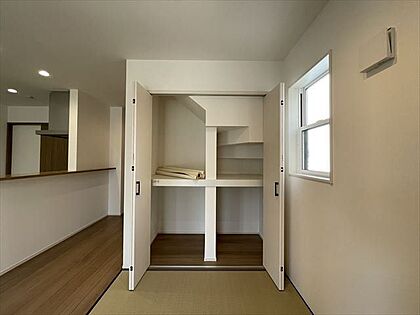 1階3帖畳コーナー:階段下スペースを活用した収納付きです。ストック品や日用品などをしまえますね。