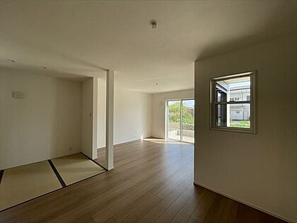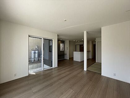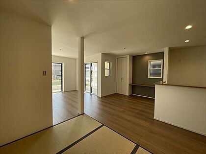 リビングには落ち着きのあるタタミコーナーがあります。窓が多く開放的なリビングです。