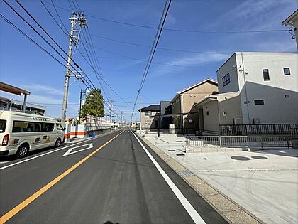 前面道路:幅員約8mの前面道路です。広々としていて、街並みが開放的で圧迫感がありません。