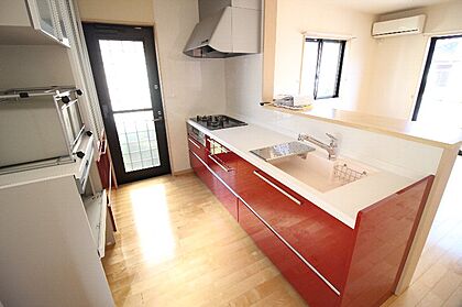 スタイリッシュなカラーのキッチンは対面式ですガスコンロも3口です