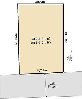 | 土地面積/坪(坪単価) | 98.34m2(登記簿)/29.8坪(318.10万円) | 代表的な接道 | 一方 公道 南 4m ※詳細は備考欄をご確認ください |