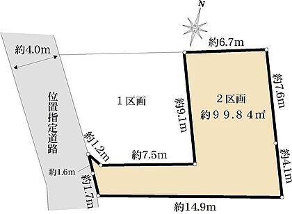 | 土地面積/坪(坪単価) | 99.84m2(登記簿)/30.25坪(164.60万円) | 代表的な接道 | 一方 私道 (位置指定) 南西 4m ※詳細は備考欄をご確認ください |