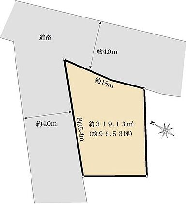 | 土地面積/坪(坪単価) | 319.13m2(登記簿)/96.71坪(39.70万円) | 代表的な接道 | 角地 公道 北西 3.5m、北東 3.4m ※詳細は備考欄をご確認ください |