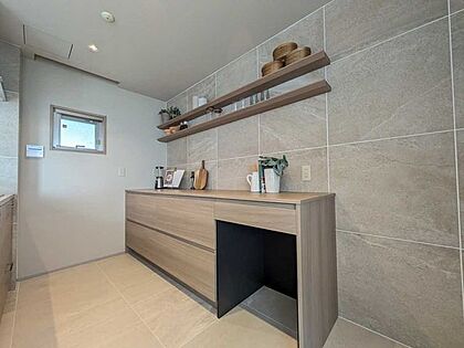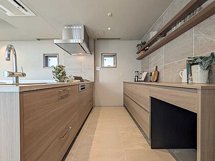 カップボード+飾り棚の造作で、収納と装飾性を兼ね備えたキッチン空間に
