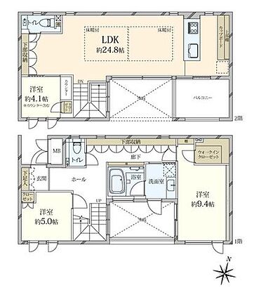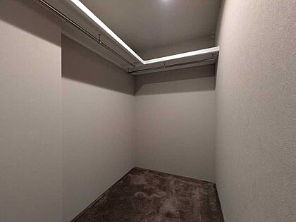 1階主寝室付設のウォークインクローゼット。床に置くと嵩張る箱物も上の棚へ収納可能