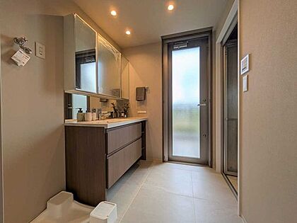 1階、扉付きの洗面室洗濯後そのままバルコニーへ移動可能です
