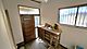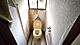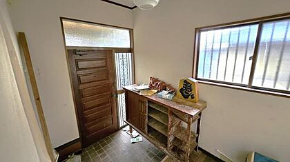 木製ドアのレトロな玄関。窓から明るい光が差し込みます。