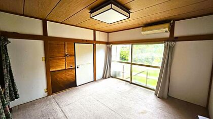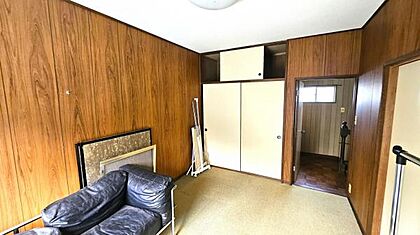 【2F洋室】 木目調の壁が落ち着いた印象を与える収納スペースが備わったシンプルな室内です。
