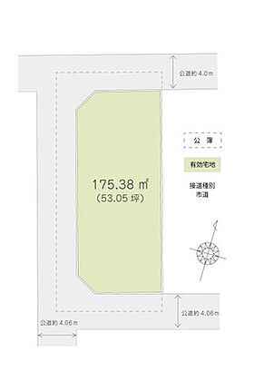 | 土地面積/坪(坪単価) | 175.38m2(登記簿)/53.15坪(14.70万円) | 代表的な接道 | 三方 公道 北 4m、西 4m ※詳細は備考欄をご確認ください |