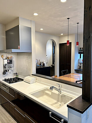 ダイニングに居る家族やゲストと同じ目線になれるよう、キッチンは一段下げる工夫を施しています◎