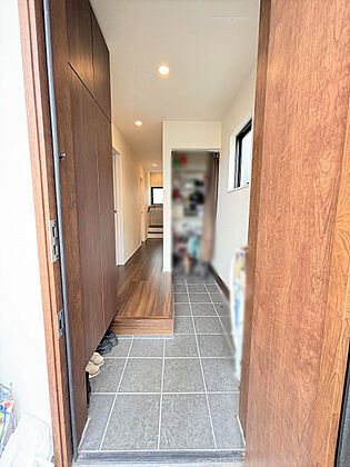 玄関先に土間収納を完備、室内にしまいにくいレジャーグッズやベビーカー、傘も片付き玄関先はいつもすっきり!