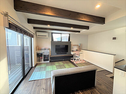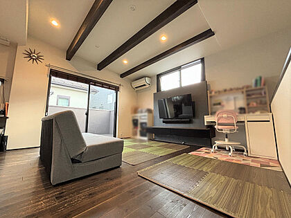 16.7帖のリビングは、梁出し天井・床は無垢材で、おしゃれな木の温かみを感じるくつろぎの空間♪