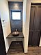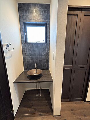 2階のおしゃれな造作洗面台。隣には可動棚収納があるので洗剤などのストック収納などに便利♪