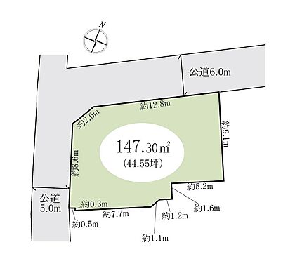 | 土地面積/坪(坪単価) | 147.30m2(登記簿)/44.64坪(33.20万円) | 代表的な接道 | 角地 公道 北 6m、西 5m ※詳細は備考欄をご確認ください |