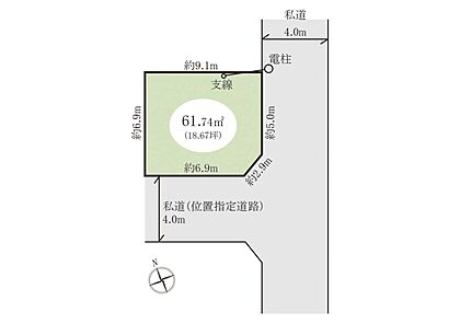 | 土地面積/坪(坪単価) | 61.74m2(登記簿)/18.71坪(68.40万円) | 代表的な接道 | 角地 私道 南東 4m、南西 4m ※詳細は備考欄をご確認ください  |
