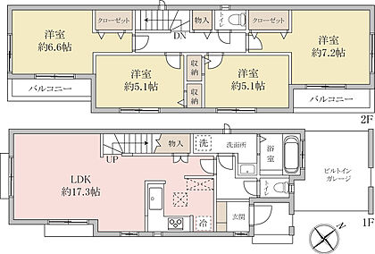 【間取-空間分け】1階はLDK・水回りの家族空間、2階は洋室4部屋のプライベート空間に分けられた間取になっております。全室東南向きのため、陽当り・風通し良好です!