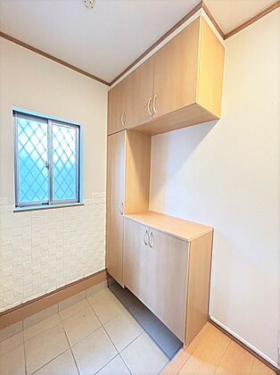 【玄関-安心】シューズボックスにカウンターがついているため、鍵や定期券など忘れがちなものを置いておくことができます。写真や芳香剤、鏡などのインテリアを飾るのもおすすめです!(2025年8月撮影)
