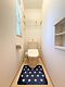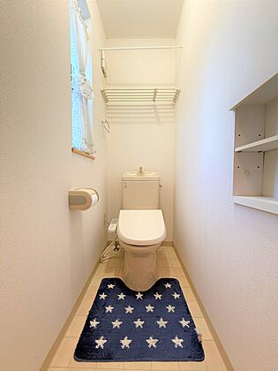 【トイレ-1階】棚がついているため、トイレットペーパーなどのストックを収納することができます。また上部に突っ張り棒で棚を設置すれば、掃除道具なども収納することができます!(2025年8月撮影)
