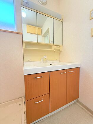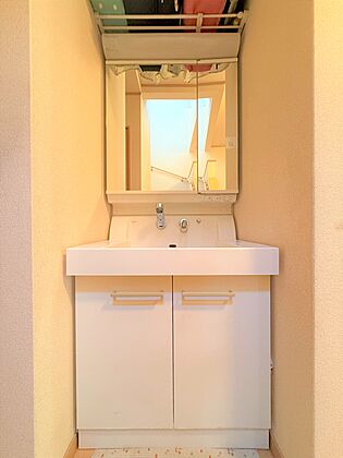 【洗面台-2階】2階に浴室・洗面室がございます。重い洗濯物でも同じフロアに干すことができるので、階段の上り下りがなくて、大変便利です!(2025年8月撮影)