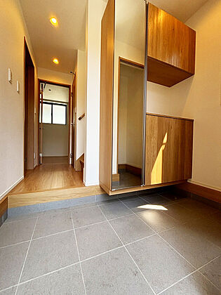 玄関にはシューズクローセットが設置されています。扉は鏡になっており身だしなみを確認出来ます。