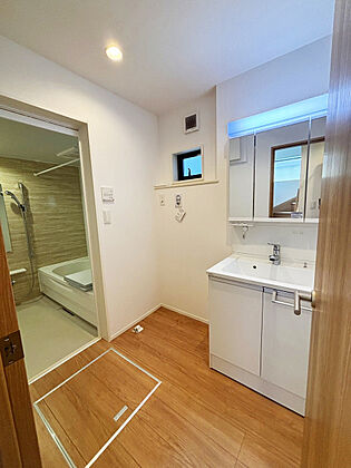 洗面台には三面鏡を採用。三面鏡裏収納付で、散らかりがちな小物がすっきり収納出来ます。