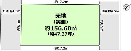 | 土地面積/坪(坪単価) | 156.60m2(実測)/47.45坪(69.10万円) | 代表的な接道 | 二方 公道 北東 4.5m、南西 4.5m ※詳細は備考欄をご確認ください |