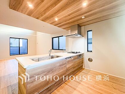 機能性とデザイン性を兼ね備えたシステムキッチン。リビングとの一体感も考慮され、美しい空間が実現。
