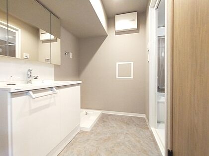 洗面化粧台は清潔感の漂うホワイトをベースカラーに、シンプルなデザインで。