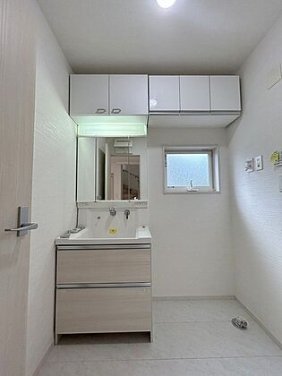 収納豊富な三面鏡付洗面化粧台。水回りのあれこれがキレイに収まりそうですね。