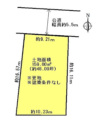 | 土地面積/坪(坪単価) | 159.00m2(登記簿)/48.18坪(66.00万円) | 代表的な接道 | 一方 公道 北 5.5m ※詳細は備考欄をご確認ください |