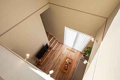 吹抜けのある開放的なリビング(LDK20.5帖)4.5帖の吹抜けは、リビング全体を明るくする大きな窓が特徴です。この窓からはたっぷりと陽光が降り注ぎ、室内は常に自然光に包まれる快適な空間を実現します。