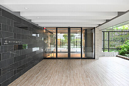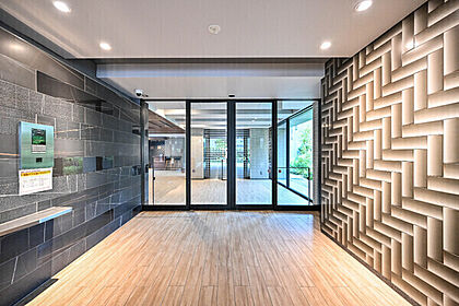 ゆとりある広さのエントランスが住民やゲストを迎えます。陽光が差し込み、植栽の緑が爽やかな印象です。【エントランス】