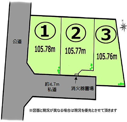 | 土地面積/坪(坪単価) | 105.77m2(登記簿)/32.05坪(46.50万円) | 代表的な接道 | 一方 私道 南 4.7m ※詳細は備考欄をご確認ください |